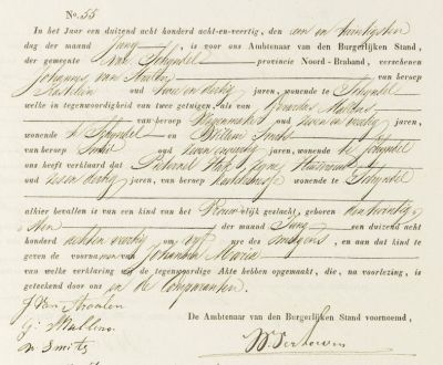 [[Afbeelding:Johanna Maria van Stralen (1848 - 1908) 01.jpg|thumb|400px|left|Geboorteakte van Johanna Maria van Stralen]] | |||
