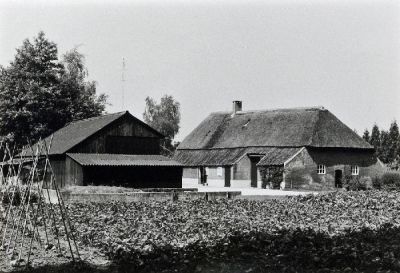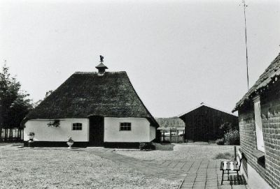 Vroegere karschop (nu opslag) onder rieten wolfkap, wit gepleisterd. Vernieuwde houten karschop.