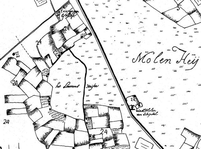 Detail van de Tiendkaart van 1757. De boerderij staat op de rand van de heide. Het weggetje dat dwars door de heide loopt (met de huidige naam "Lieseinds Heike") gaat naar de huidige Lieseindsestraat.