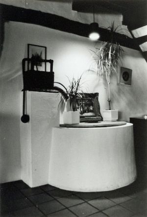 Oude balken bewaard, evenals schouw met schildpadtegels, ijzeren deurtje naar over, pomp en put.