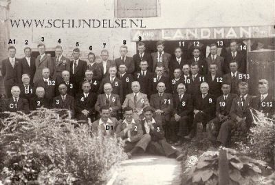 Rij B: 1. Jan van Heesch, 2. Toon Kemps, 3.mHarrie Schevers, 4. Janus Persons, 5. Gijs van der Spank (zoon van Driek), 6. Janus van Heeswijk, 7. Tijn Persons, 8. Huub Persons, 9. Harrie Verhagen, 10. Marinus Pijnenburg, 11. Willem Timmermans, 12. onbekend, 13. Marinus Verhoeven, 14. Toon Pijnenburg, 15. Toon Kemps, 16. Jo van de Plas?, 17. Mies Verhagen (broer van wethouder Piet), 18. Jan van Liempd, 19. Willem Timmermans, 20. Marinus van der Spank (zoon van Driek), 21. Toon van den Boogaard, 22. Janus Verhagen (Hopstraat), 23. Kees Keetels (vader van Cor).