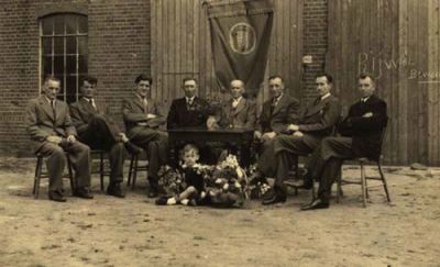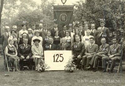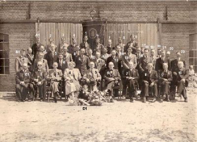 Rij C zittend: 1. Gerard van Liempd, 2. Jan van Thiel, 3. onbekend, 4. mevr. Bolsius, 5. Harrie Bolsius, 6. burgemeester Wijs, 7. Janus Kemps, 8. Tinus Kemps, 9. Piet Kemps, 10. Bertus Kemps, (C7 t/m 10 zijn broers),