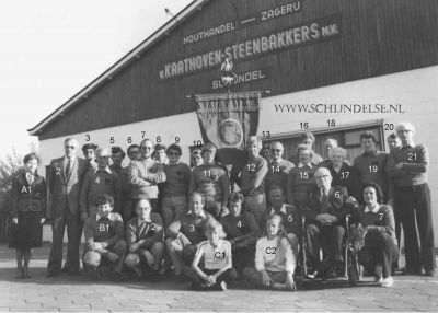 Rij A: 1. Mevr. Van Kaathoven Steenbakkers, 2. Albert van Kaathoven, 3. Marijn Schellekens, 4. Piet Pijnenburg, 5. Henk van Kaathoven, 6. Marinus Verhoeven, 7. Theo van der Sangen, 8. Dre van den Boogaard, 9. Joke van der Sangen, 10. Rina van den Boogaard (de vrouw van Frans), 11. Hennie van den Elzen, 12. Toon van den Brand, 13. Will den Otter, 14. Harrie van den Heuvel, 15, Gon van den Boogaard, 16. Ankie Schellekens, 17. Marie van den Boogaard Merkx, 18. Jan van Heertum, 19. Marie van den Boogaard, 20. Frans van den Boogaard, 21. Piet Vervoort.