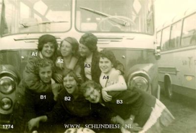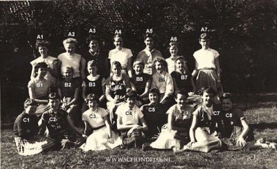 Rij A: 1. Annie Hoogendorf? 2. Rikie van den Broek, 3. Marianne van Vessem, 4. Onbekend, 5. Marijke Schevers, 6. Onbekend, 7. Onbekend, 8. Onbekend, 9. Onbekend, 10 Henriëtte van de Sanden, 11. Onbekend.