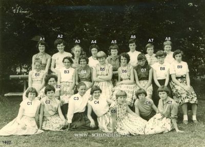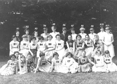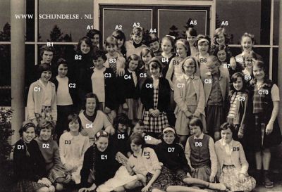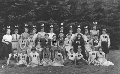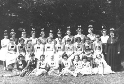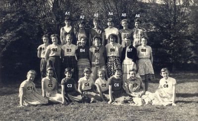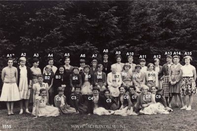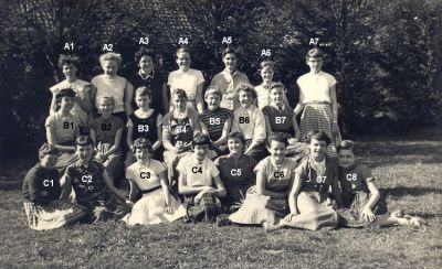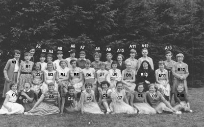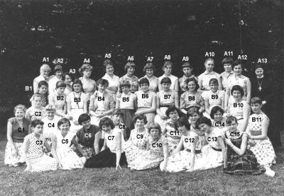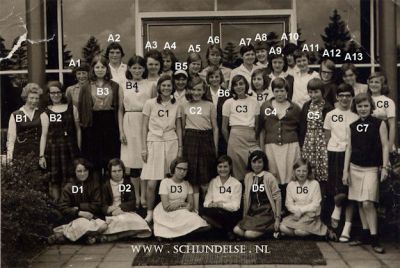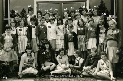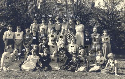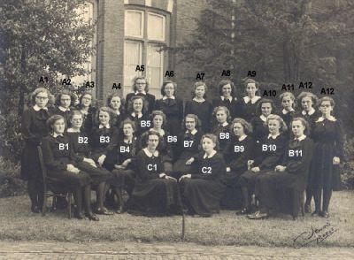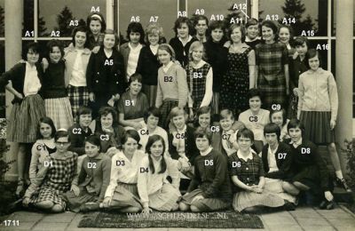 Rij A: : 1. Ingrid Hartman (dochter tandarts), 2. Onbekend, 3. Letty Graafmans, 4. Ineke van Tuijl, 5. Marjan de Jong, 6. Onbekend, 7. Onbekend, 8. Willemien Rooijakkers, 9. Jet Schraven, 10. Rian van der Eerden?, 11. Onbekend, 12. Corrie Oerlemans, 13. Miep Fassbender, 14. Dini Steenbergen, 15. Jeanne van Rooij, 16. Egidia van den Broek (internaat), 17. Ton van den Hoogen (internaat), 18. Wil Verhagen.