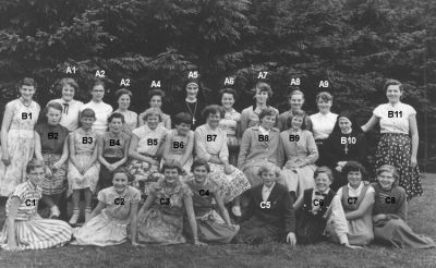 Rij C: 1. Thea van Tartwijk, 2. Mien van Hooft, 3. Marijke Bolwerk, 4. Thea de Visser 5. Jacqueline van den Heuvel, 6. Gerdie Seegers 7. Onbekend, 8. Corrie de Beer.