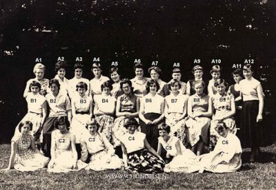 Rij A: 1. Dinie Bekkers, 2. Mia van der Loop, 3. Marie Jose Schiffer, 4. Betsie Streppel, 5. Francine Goudsmits (internaat), 6. Thea van de Eng, 9. Mimi Hermes, 10. Irene Boogerd, 11. Onbekend.