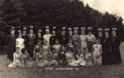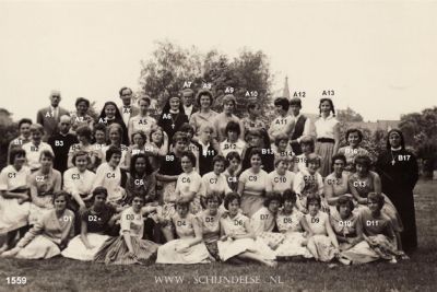 Rij B: 1. Annie Cremers, 2. Rietje van de Leest, 3. Mia van Genugten, 4. Onbekend, 5. Onbekend, 6. Onbekend, 7. Onbekend, 8. Sjan Kooijmans, 9. Will Bode, 10. zuster Paulin, 11. Bep van Wanrooij, 12. Onbekend, 13. Annie Heldens, 14. Ria van de Steen, 15. Dory Dito, 16. Jos Venraaij.