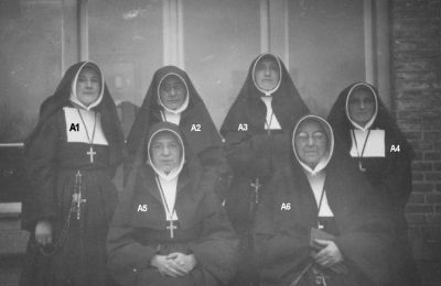 1. Zr. Chrysogona van Boxtel, 2. Zr. Geertruda Schellekens, 3. Zr. Theodora Vernooy, 4. Zr. Marie Bernardine Weernink, 5. moeder Elise van der Heijden, 6. Zr. Marie Heijmans.