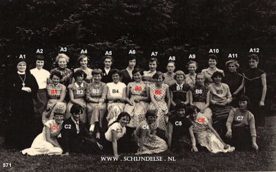 Rij B: 1. Onbekend, 2. Onbekend 3. Truus Fleuren (internaat), 4. Marianne Peeters Weem (internaat), 5. Marian Scheepers (internaat), 6. Annie Pennings, 7. Onbekend, 8. Onbekend, 9. Onbekend, 10. Ria van Hedel, 11. Onbekend.