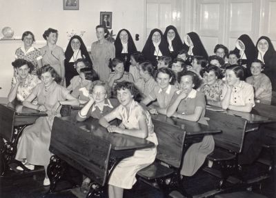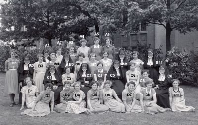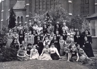 Rij D: 1. Onbekend, 2. Mien de Louwere, 3. Annie Schaffrat, 4. Toos van der Heijden, 5. Johanna Hamelynck, 6. Annie Beijers, 7. Jaantje van Alebeek, 8. Anna Melis, 9. Annie van de Steen, 10. Trees van Wychen, 11. Jo Goudsmits?, 12. Ton van de Velden, 13. Aloysia Sterke, 14. Johanna Janssen, 15. Minkels, 16. Jeanne van Dongen, 17. Drea Coppens, 18. Corrie van Loosdrecht.