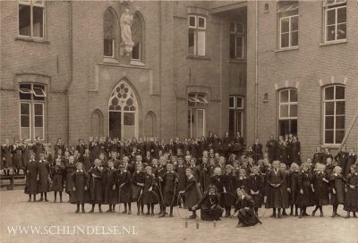 Uit het eeuwfeestjaar 1936 is deze unieke foto bekend van Mater Christi. Van de vier cursussen staan de allerkleinsten voorop en de ouderen bovenin. De foto is genomen bij de koepel in de kloostertuin met alle mulo-leerlingen uit 1936 en is overhandigd door Zr. Margarethe van Uden, die zelfs in staat bleek om, in nauw overleg met oud-klasgenoten en tevens met behulp van oude puntenlijsten uit die periode, heel veel namen te achterhalen, zodat we nu de meeste meisjes van naam kennen die toen op het mulo-internaat zaten. Een fantastisch resultaat als we bedenken dat we praten over 70 jaren geleden. We willen die foto het lezerspubliek niet onthouden, temeer daar er vast en zeker Schijndelse moeders of oma's op zullen staan!