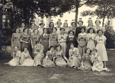 Rij F: 1. Nelly van den Hoogen, 2. Thea Hellemonds, 3. Dina Cornelissen, 4. Doortje Lomme, 5. Nella Bosch, 6. Willie Smits, 7. Jo (Dorry) van Hoof, 8. Hortence van Hoorn, 9. Tinie de Martinez, 10. Martha van Berlo?, 11. Electa Tijhuis, 12. Jo Kuiten, 13. Jo Kasteleijns, 14. Lien Hendriks, 15. Bep Hendriks, 16. Toos Hendriks, 17. Jo Peijnenburg, 18. Bertha Pennings, 19. Corrie van Uden.