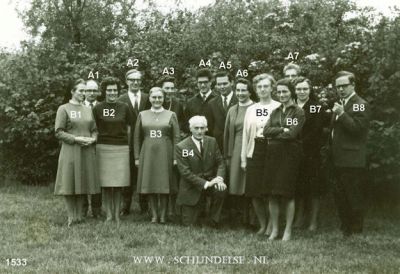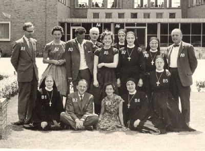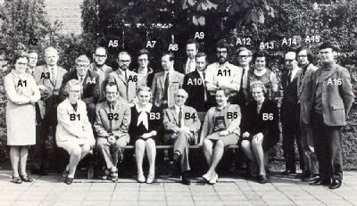 Rij A: 1. Dien Bongers, 2. Theo van Dijk, 3. Johan Plegt, 4. J. Volwater, 5. Gerard te Dorshorst, 6. Jan Raaijmakers, 7. Zr. Pauline Lagarde, 8. Piet Creemers, 9. Theo van Heijningen, 10. Martie Versantvoort, 11. Hans Ketelaars, 12. George Cornelis, 13. Mia Schellen, 14. Con Lauret, 15. Jan van de Wiel, 16. Ton van den Heuvel.