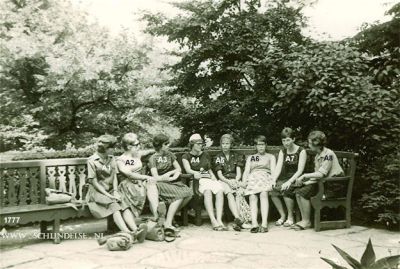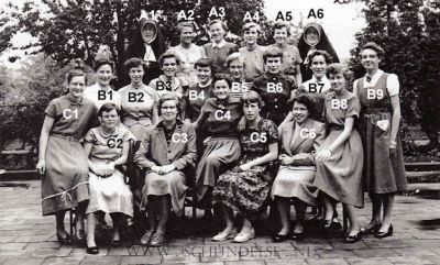 Rij A: 1. Anneke Geurtsen, 2. Joke Fassbender, 3. Jeanne van Dijk, 4. Annie van de Kamp, 5. Gonnie van de Wijdeven, 6. Onbekend, 7. Joke Foolen (1942 - 1960).