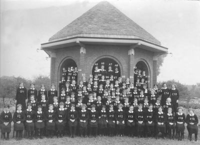 De 86 mulo-leerlingen in 6 rijen uit 1936, mooi in uniform onder de koepel in de kloostertuin, vergezeld van 2 zuster. De koepel is tijdens de Tweede Wereldoorlog verwoest en later door een andere vervangen.