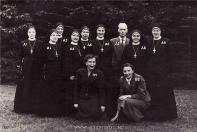 Rij A: 1. Zr. Maria Magdalena, 4. Zr. Gemma (overleden in 2009), 3. Zr. Pauline, 6. Zr. Heleni, 7. Dhr. Adrianus Verkuylen, 8. Zr. Jacquelino, 9. Zr. Aloysa (Mahieu)?