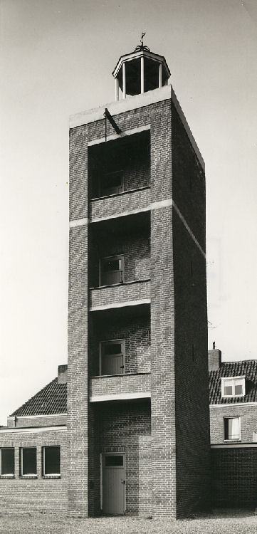 Vrijstaande bakstenen toren met opengewerkte "klokkenstal" voor de brandweer.