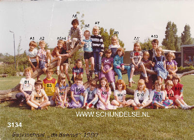 Rij A: 1. juffrouw Annemarie van Tartwijk, 2. Richard Schellekens, 3. Antoinette van de Broek, 4. Brigette van der Heijden, 5. Gonnie Mettler, 6. Inge Wouters, 7. Miranda Pijnenborgh, 8. Carolien Terveer, 9. Marcel Habraken, 10. Robert van Geffen, 11. Herbert Raaymakers, 12. Paul van Beckhoven, 13. Han Bakermans, 14. Hans Kanders, 15. Arthur Diebels, 16. Arie van den Brand, 17. onderwijzer Henk Beijers.
