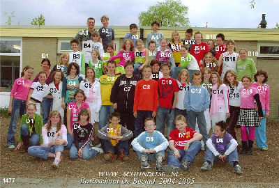 Rij C: 1, Yvonne van Kaathoven, 2. onderwijzer Jos Giesbers, 3. Annick Beyer, 4. Bas Hoogzaad, 5. Thies van Oss, 6. Jelmar van Voorst, 7. Silke van Houtum, 8. Remco van Rijbroek, 9. Jan Simons, 10. Marloes Brouwer, 11. Nicole Voets, 12. Crystal Reynen, 13. Amy Deelen, 14. Lauren Dautzenberg, 15. onderwijzer Anton Hellings, 16. Angela van de Koevering.