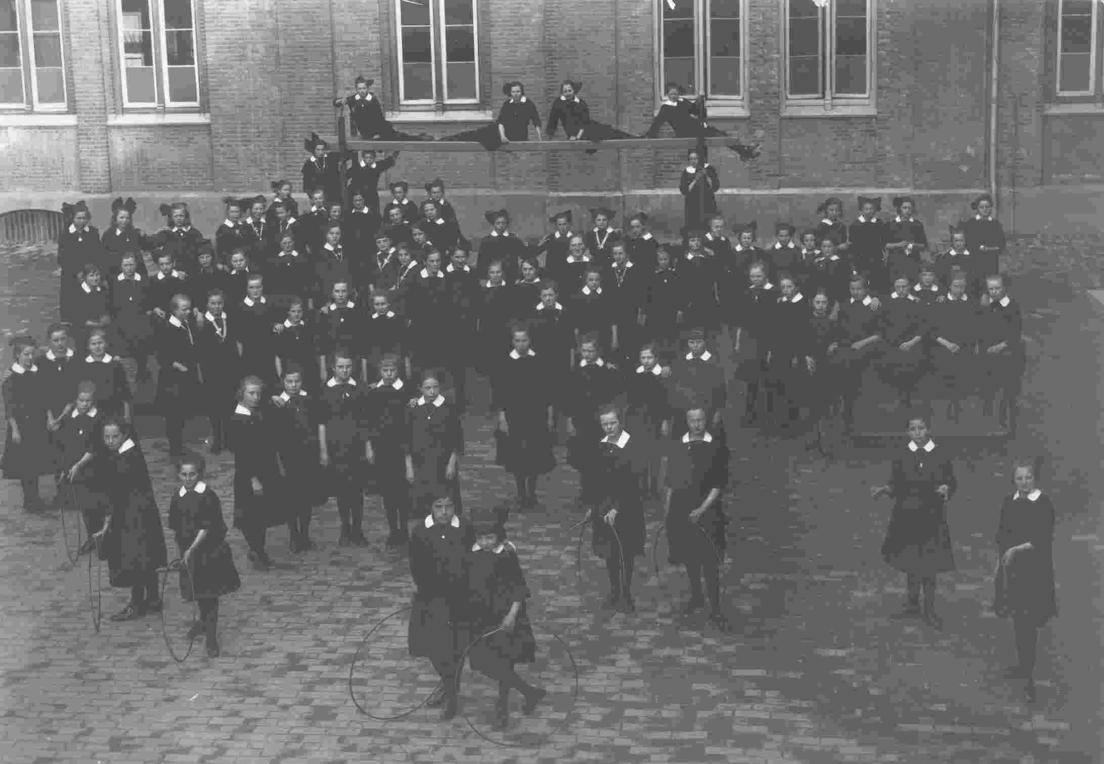 Speelpauze met o.a. hoepels op de speelplaats onder leiding van zuster Theresiana Horbach op de speelplaats van de voorbereidende klassen (vermoedelijk rond 1910).
