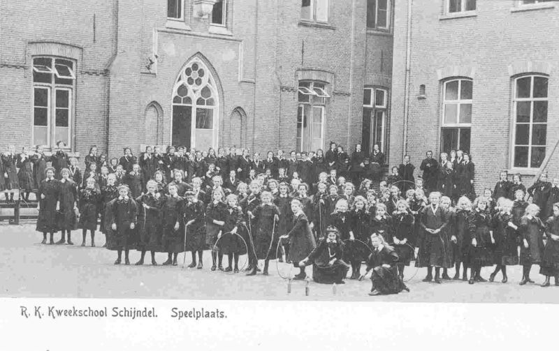 Speelpauze op de speelplaats van de oude kweekschool rond 1900.