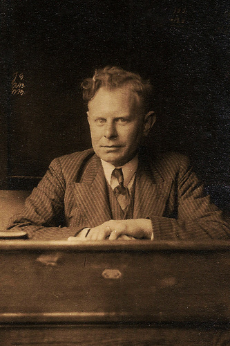 De heer De Koning onderwijzer aan de Lambertus jongensschool aan de Pompstraat.