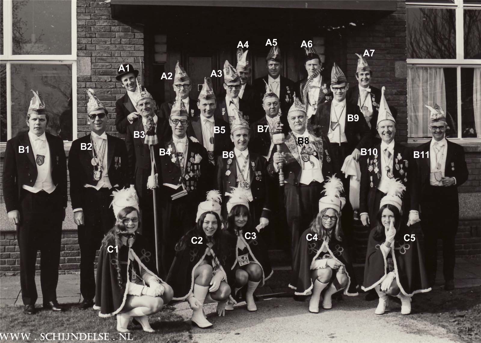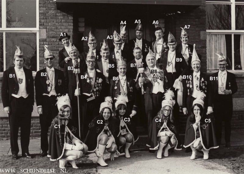 Tweede rij B: 1 Bertus Fassbender, 2 Ted Stein, 3 Paul Wemering, 4 Huub Ketelings, 5 Guus Dijkstra, 6 Nol van Roessel (broer A1), 7 Jo Janssen (broer B10), 8 Jan Cleij (prins carnaval), 9 Herman Mautman, 10 Theo Jansen (broer B7), 11 Johan van Doremalen