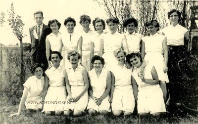 Deze foto is in 1957 tijdens een toernooi in Empel gemaakt waar de dames per fiets naar toe waren gereisd. Zo deden ze dat bij alle uitwedstrijden.
