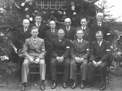 Staand vanaf links: Jan Broeren, Toon Schaakenraad, Harrie Broeren, Hermes Arts, Mies Mettler en Antoon Jonkers (veldwachter)