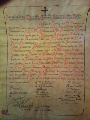 Bovendien bleek zich tussen de archiefstukken een fraaie perkamenten oorkonde te bevinden, die was opgemaakt ter gelegenheid van de eerste steenlegging van het patronaatsgebouw Sint Joseph op 13 mei 1907. De oorkonde zat verborgen in een kokertje met daarin het perkamenten archiefstuk. De tekst van deze oorkonde, die hierna in extenso volgt, geeft een idee wie bij die eerste steenlegging waren betrokken.