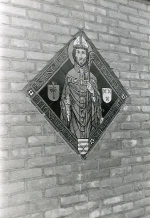 Tegeltableau afkomstig van het hier gestaan hebbende patronaatshuis uit 1907 met afbeelding van Sint Servatius met staf en sleutel.