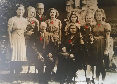 Rij A staand: 1. Henrica Wilhelmina gehuwd met Antonius Everardus van Esch, 2. Wilhelmina (Mia) gehuwd met Peter Joannes Jacobus Michels, 3. Johannes Jacobus (Jan) gehuwd met Betty Cecilia Lillian Chamberlain, 4. Henriette Cornelia (Corrie) gehuwd met Vincent van Rossum, 5. Antonia Johanna (Tonnie) gehuwd met Petrus Koppers, 6. Adriana Josepha (Sjaantje) gehuwd met Johannes Broeren, 7. Martina Maria (Diny) van de Weijenberg gehuwd met Jan van Rossum.